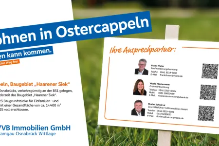 Mit dem Neubaugebiet "Haarener Siek" schließen wir unmittelbar an die Bebauung der beiden Baugebiete 'Bergfrieden' und 'Zur Bergwiese' in Ostercappeln an. Ohne Bauträgerbindung und provisionsfrei haben Sie die Möglichkeit, diese Baugrundstücke direkt von uns, der VVB Immobilien GmbH als Erschließungsträger, zu erwerben. Insgesamt sind hier 23 Baugrundstücke entstanden. Das vorgesehene Baugrundstück hat eine Größe von 738 m². Hinterlassen Sie uns gerne bei Interesse eine Nachricht. Wir kommen dann gerne auf Sie zu!